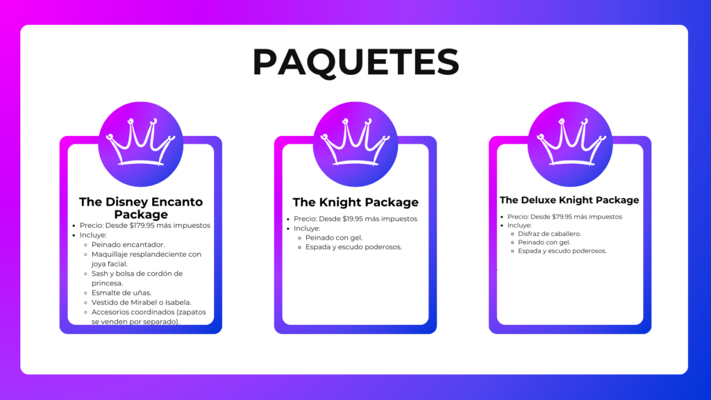 La aventura comienza con una cálida bienvenida de las Hadas Madrinas, quienes guiarán a los pequeños en todo el proceso de transformación. Seleccionar el atuendo perfecto, elegir un peinado digno de la realeza y recibir un toque de maquillaje mágico son solo algunos de los momentos emocionantes que los niños vivirán durante su transformación.